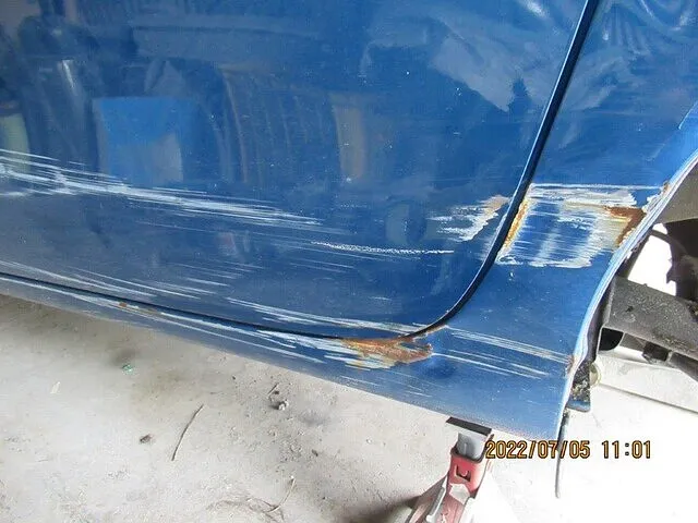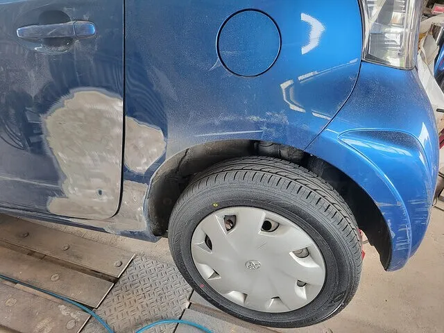 安く仕上げるなら、中古車仕上げのように鈑金にあまり時間をかけずパテを多く使うと割と安く修理することができます。ただ、ドアなどは開閉の振動で後からパテが割れてきたり修理した部分の重量が重くなりますので、出来るだけ鈑金で修理してパテは薄く使うやり方を行っています。